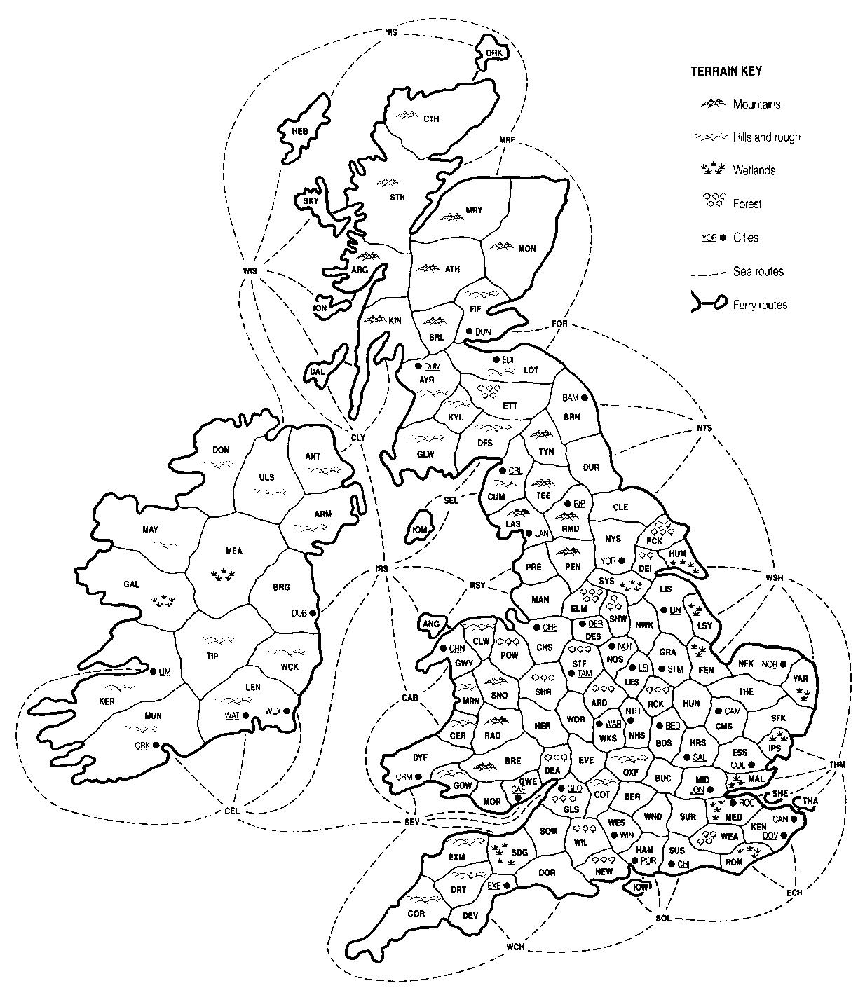 The Map is divided into land and sea areas. The land areas have all sorts of terrain in them, and the terrain type decides how much population can live in each area. It also has an effect on movement. In sea areas you can put ships, and the ships can carry armies. Land areas contain armies and population, and some contain cities.